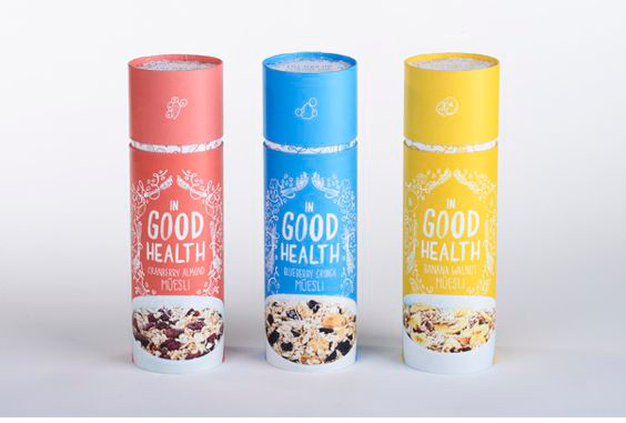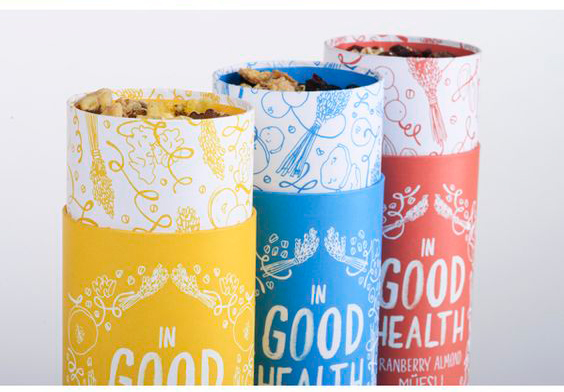 ? ? 我們在生活中經(jīng)常見到的食品包裝一般是袋裝、盒裝或塑料罐裝的,像圖片中這種圓紙筒形狀的食品包裝設(shè)計還是比較少見的,三種口味的麥片分別用三種不同的顏色區(qū)分,手繪圖案和字體倍顯清新溫暖。